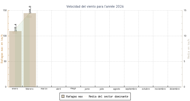 | enero | 0.8 C el 5 | 5.2 C | 17.1 C el 8 | 12.4 C | 8.7 C | 11.4 km/h | 109.4 km/h | OSO |