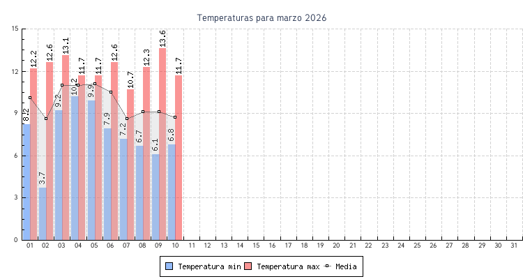 | 01 | 8.2 C a las 00:00 | 12.2 C a las 15:40 | 10.1 C | 3.2 km/h (22.5 km/h) | E |
