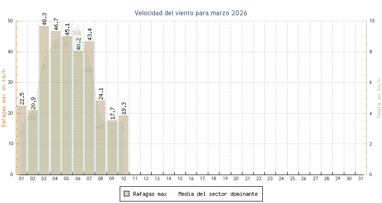 | 04 | 10.2 C a las 07:10 | 11.7 C a las 03:30 | 11.0 C | 8.8 km/h (46.7 km/h) | N |